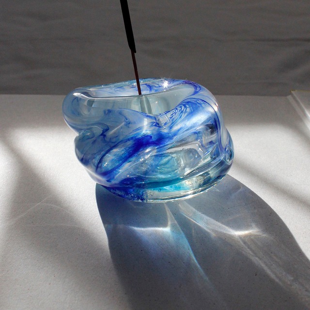 お香の香りを楽しみながら、揺らぐ煙とともにガラスを透過する光をゆったりと眺めていたくなる----- そんな、五感で味わうひとときのために作った特別なお香たてです。 使うことそのものが、ひとつの鑑賞になるようなガラスです。 お香に火を灯す時間、ふと手に取るしぐさ—— 晴れの日も、雨の日も。 静かな時間に、そっと寄り添います。 光があたるとガラスがきらきらと煌めき、窓からの光の差し込み方で刻々とかわる美しい表情を楽しめます。 今回のCelestiaは、夜空にひっそり輝く星々のように、 光と空気の層がそっと揺れる、小さな宙を閉じ込めたかのような透き通る表情が特徴です。 ガラスの中で柔らかくきらめく気泡のヴェールは角度によって表情を変え、 表面の繊細な立体感が光を受けて、まるで風にそよぐ水面のようにきらめきます。 眺めているだけで心がほどけていく感覚を楽しめます。 お香がそっと斜めに立つデザインで、煙の流れや香りがより美しく映し出されます。 ひとつひとつ手作業で作る完全一点もの。 再生ガラスならではの淡いグリーンがかった透明感が、柔らかさと温もりを添え、手にするだけで“特別な時間”を感じられる存在です。 情報が溢れる毎日の中で スマホやPCの画面から離れて ただのんびりと 香りとひかりの揺らぎを味わう時間 そんなゆったりとしたじぶん時間をお届けします ただのんびりと なんにも考えずに 五感を研ぎ澄ます 大好きな自分にご褒美じかん はじめませんか。 お気に入りのリングや耳飾りを飾る、ジュエリートレーにしたり、そのまま光を飾るオブジェにしても素敵です。 あなたの暮らしにそっと特別な煌めきを運んでくれる、そんな一点です。 材質 ガラス サイズ 直径約9cm 厚み約3.5cm