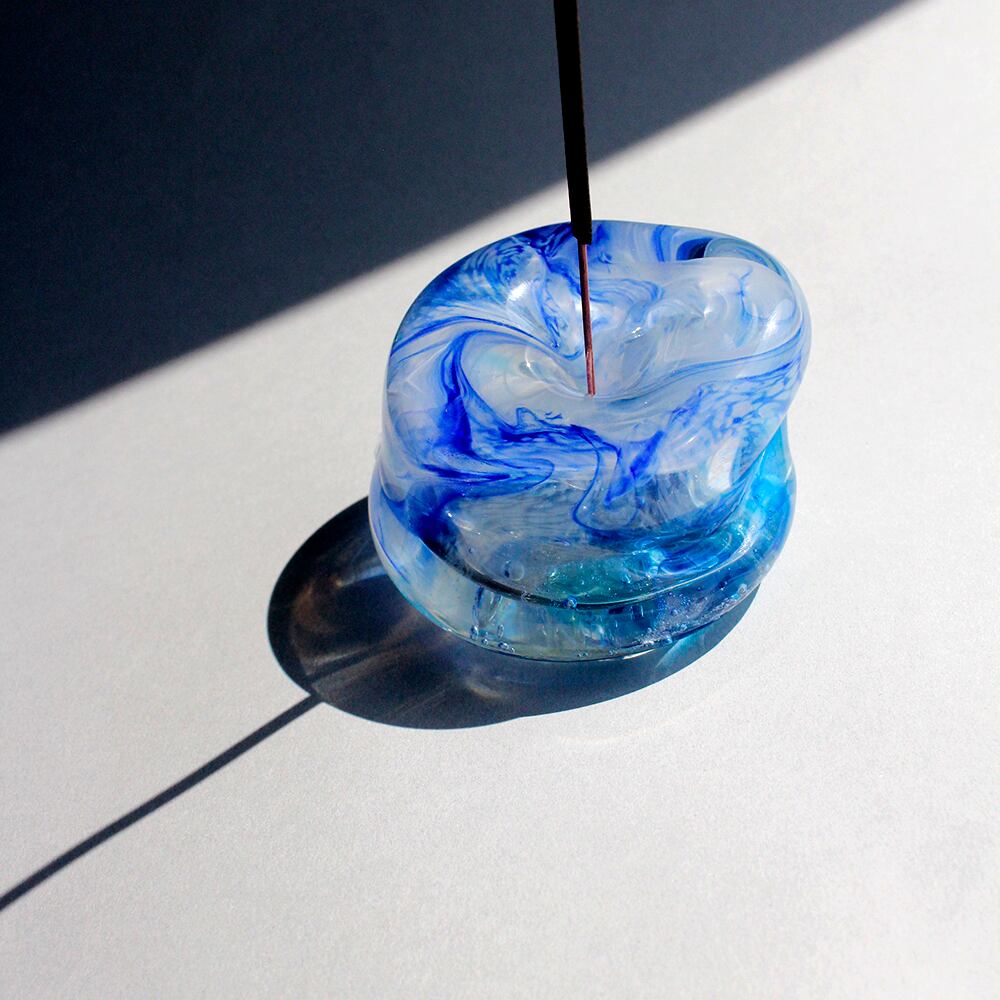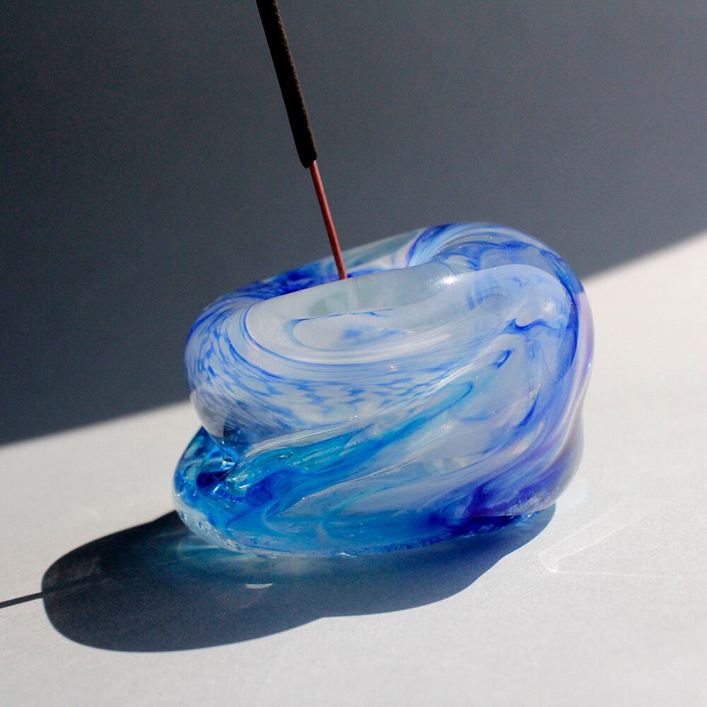 再生ガラスを1300度以上の高熱で溶かし、ガラスを巻き取って一点一点色を混ぜて形を作り上げて製作した完全1点もの。