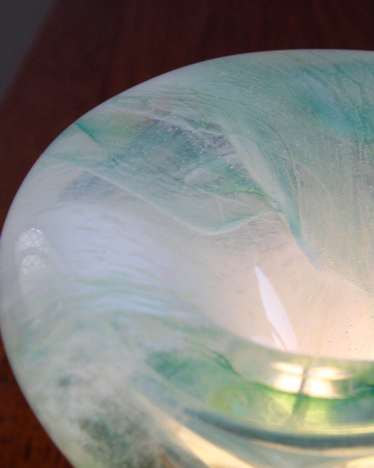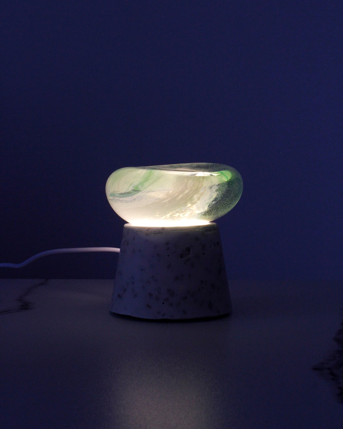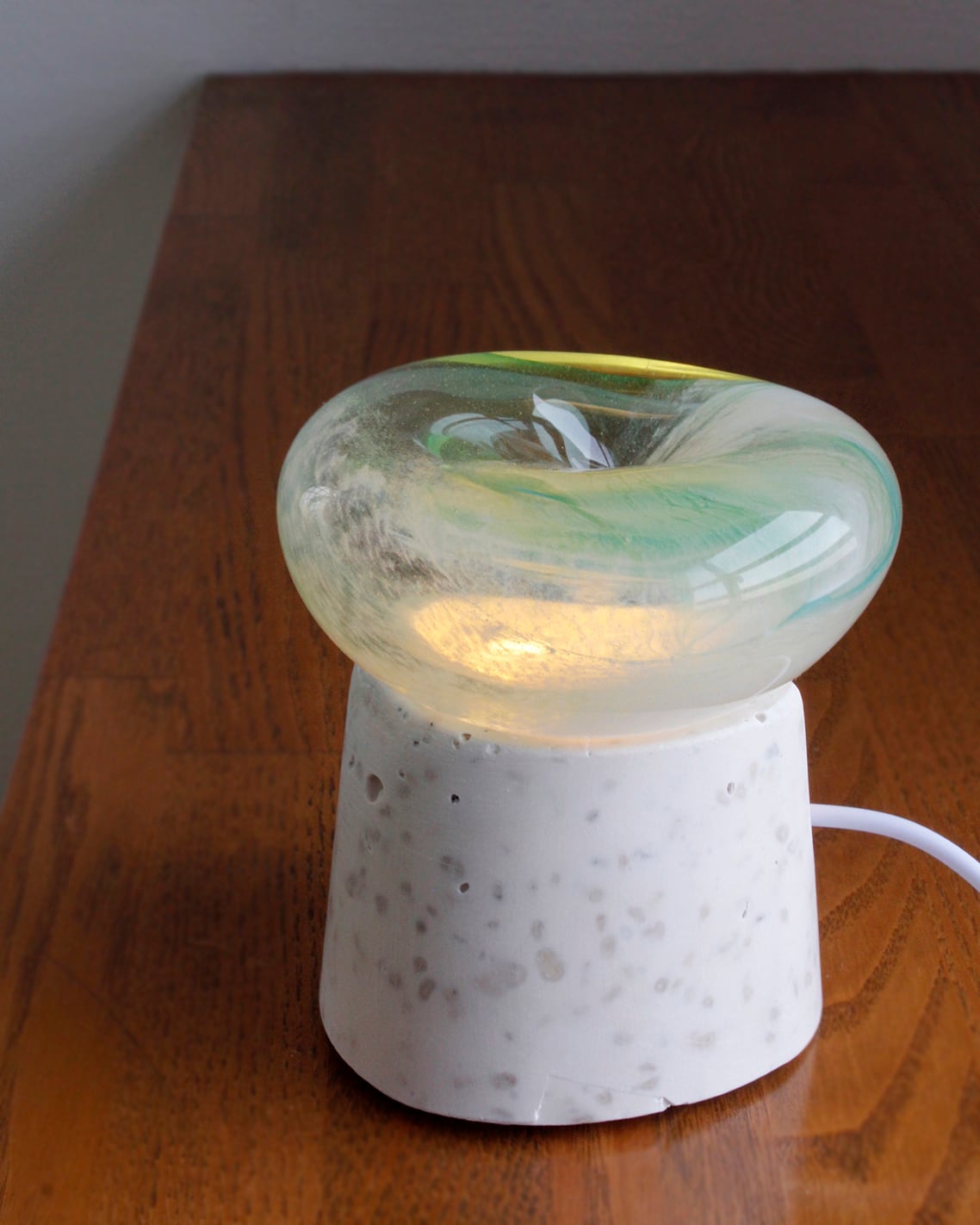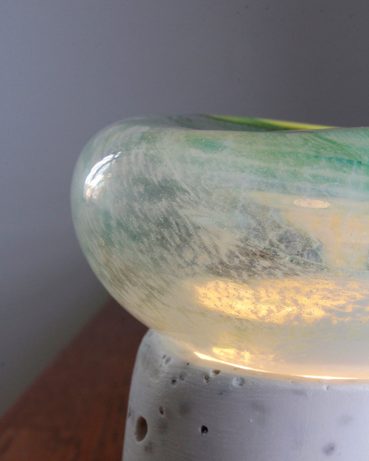 本作品は、吹きガラスと異素材の台座を一体として制作した光のオブジェです。