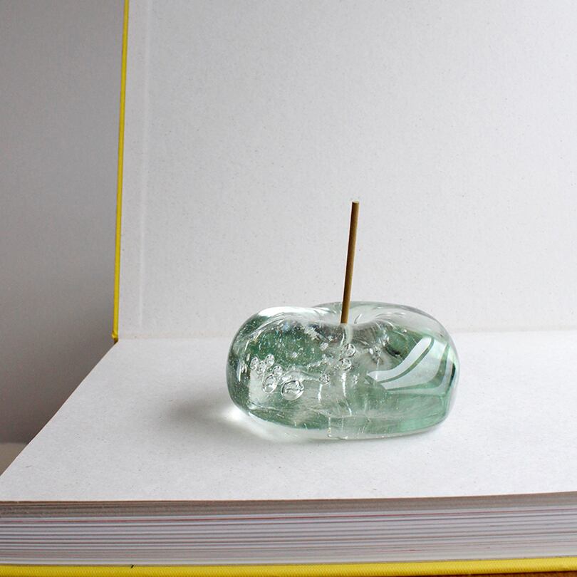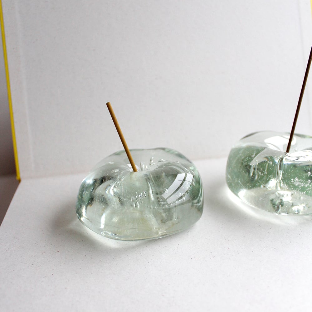 お香の香りを楽しみながら、揺らぐ煙とともにガラスを透過する光をゆったりと眺めていたくなる、とろける氷をイメージして製作したお香たてです。