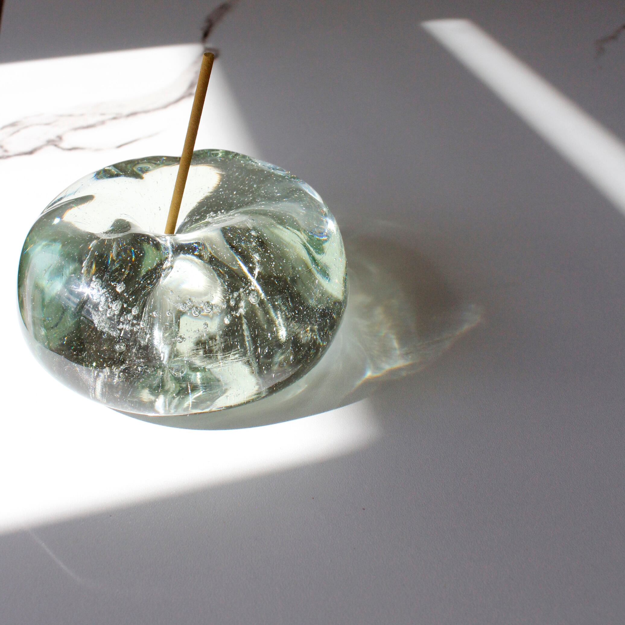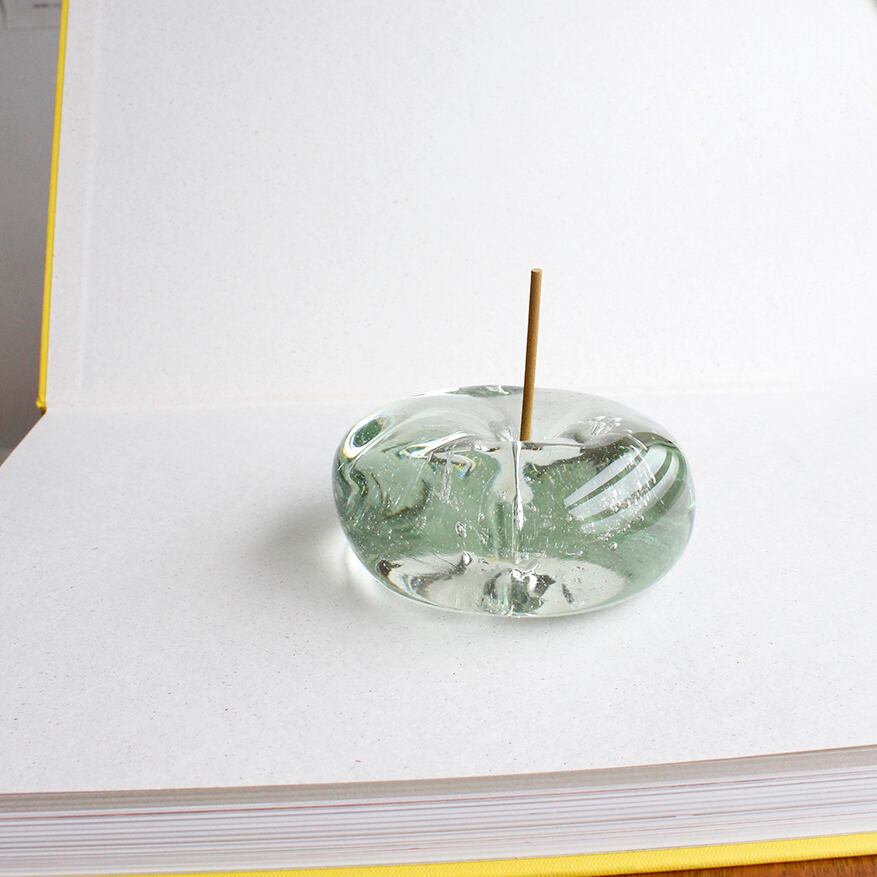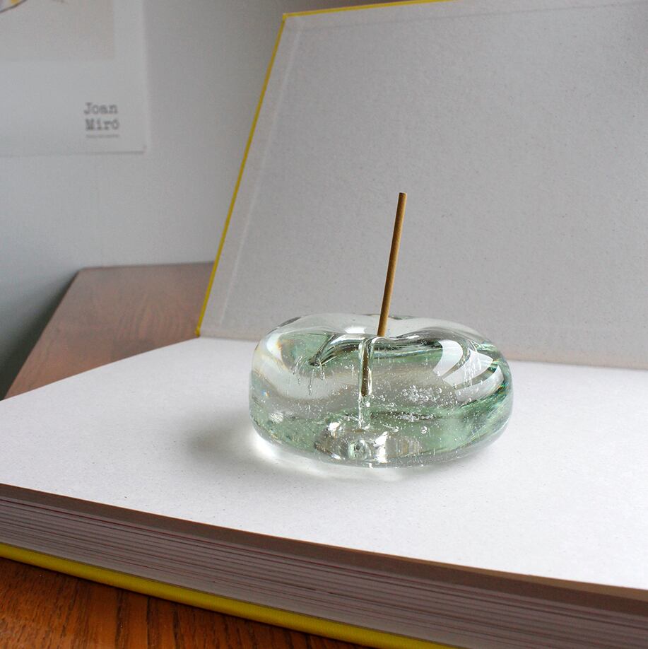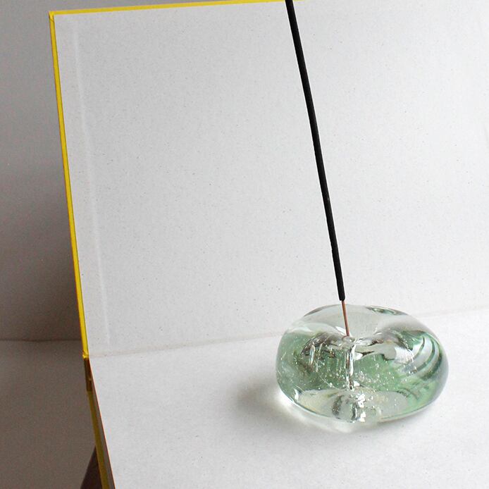 お香の香りを楽しみながら、揺らぐ煙とともにガラスを透過する光をゆったりと眺めていたくなる、とろける氷をイメージして製作したお香たてです。