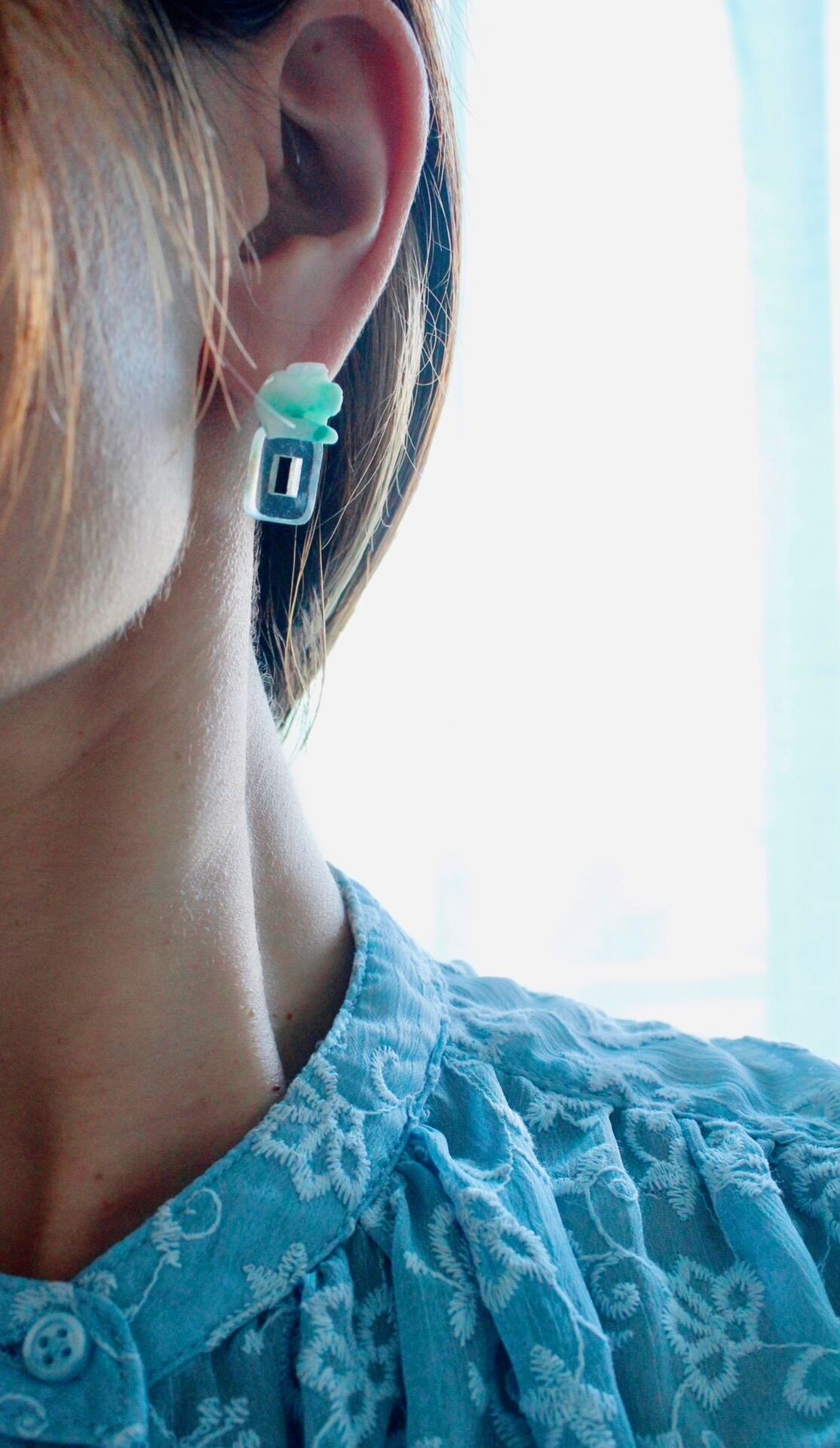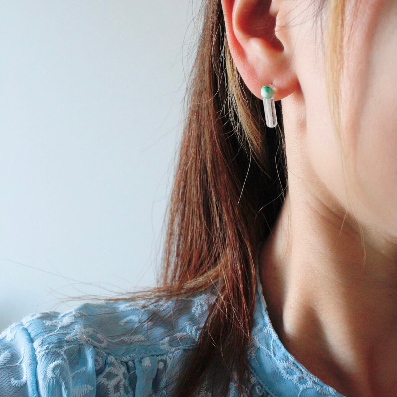 ガラスビーズの色と透明感に添えるのは、メロンソーダみたいなマーブルカラーのアートピース。アシンメトリーデザインのもう片方には、同じくヤブロネツで買いつけてきたぽってりとしたフォルムと透明感が美しいガラスビーズに、生き生きとしたグリーンのアートピースを施しました。